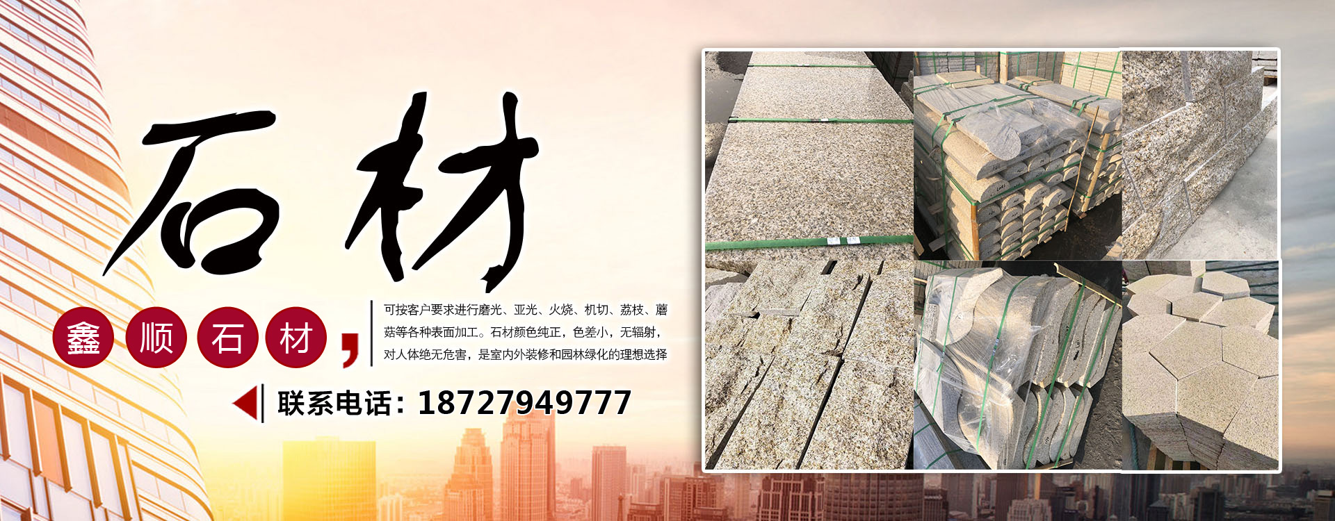 隨州市鑫順石材有限公司位于湖北省隨州市隨縣萬和鎮桐柏山。是一家集礦山開采、石材加工、異形制作、產品銷售為一體的大型綜合型石材企業!本公司主要經營:中花白麻,小花白麻,黃金麻,黃金鉆,芝麻灰,鐘山青,芝麻黑,泌陽紅,各類異形石材。生產的石材規格齊全、做工精細,被廣泛用于外墻干掛、廣場地鋪、市政園林、建筑工程、環境景觀異形石材等各類建筑墻體、地面的裝飾裝修。公司專注于石材行業多年,生產優質的無色差優質白麻,永不吐銹量大,穩定,主攻高鐵站,地鐵站,機場等大型市政房產??沙薪痈鞣N異形加工,速度快,質量無憂。我們秉承“誠信經營,服務為本”的經營理念,竭誠為廣大客戶提供優質的產品和滿意服務,期待與您的合作,竭誠歡迎國內外新老客戶前來訂購洽談!